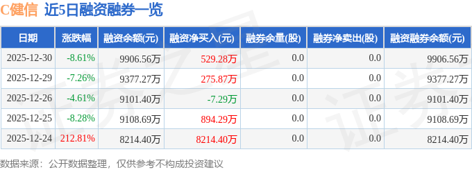 C健信融资融券信息显示,融资方面,当日融资买入2659.78万元,融资偿还2130.5万元,融资净买入529.28万元。融券方面,融券卖出0.0股,融券偿还0.0股,融券余量0.0股,融券余额0.0万元。融资融券余额9906.56万元。