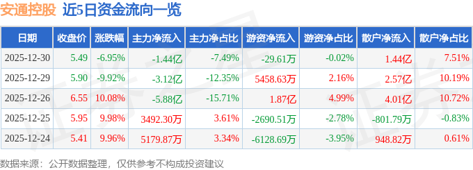 证券之星消息,截至2025年12月30日收盘,安通控股(600179)报收于5.49元,下跌6.95%,换手率8.74%,成交量337.61万手,成交额19.2亿元。