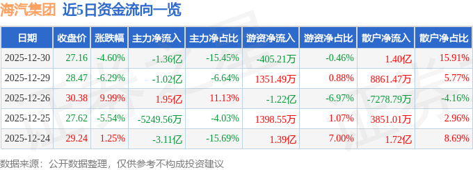 证券之星消息,截至2025年12月30日收盘,海汽集团(603069)报收于27.16元,下跌4.6%,换手率10.13%,成交量32.01万手,成交额8.8亿元。