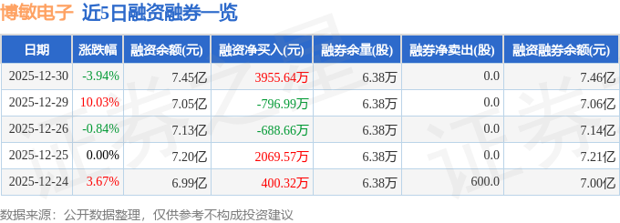 博敏电子融资融券信息显示,融资方面,当日融资买入1.27亿元,融资偿还8766.24万元,融资净买入3955.64万元。融券方面,融券卖出0.0股,融券偿还0.0股,融券余量6.38万股,融券余额79.37万元。融资融券余额7.46亿元。
