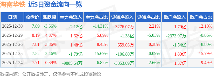 证券之星消息,截至2025年12月30日收盘,海南华铁(603300)报收于7.89元,下跌3.66%,换手率9.29%,成交量185.53万手,成交额14.81亿元。