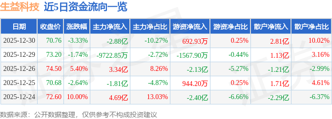 证券之星消息,截至2025年12月30日收盘,生益科技(600183)报收于70.76元,下跌3.33%,换手率1.64%,成交量39.21万手,成交额28.08亿元。