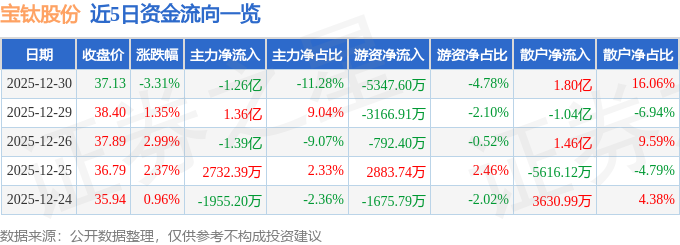 证券之星消息,截至2025年12月30日收盘,宝钛股份(600456)报收于37.13元,下跌3.31%,换手率6.29%,成交量30.04万手,成交额11.2亿元。