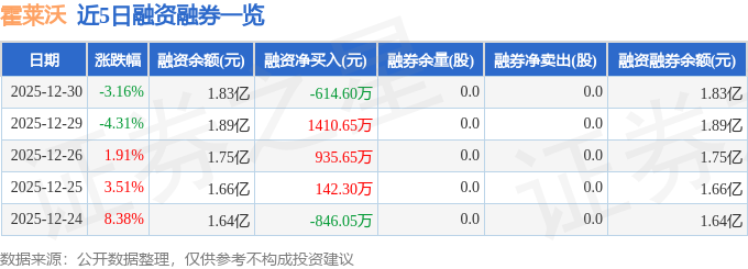 霍莱沃融资融券信息显示,融资方面,当日融资买入2404.91万元,融资偿还3019.51万元,融资净偿还614.6万元。融券方面,融券卖出0.0股,融券偿还0.0股,融券余量0.0股,融券余额0.0万元。融资融券余额1.83亿元。