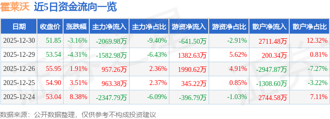 证券之星消息,截至2025年12月30日收盘,霍莱沃(688682)报收于51.85元,下跌3.16%,换手率4.1%,成交量4.17万手,成交额2.2亿元。