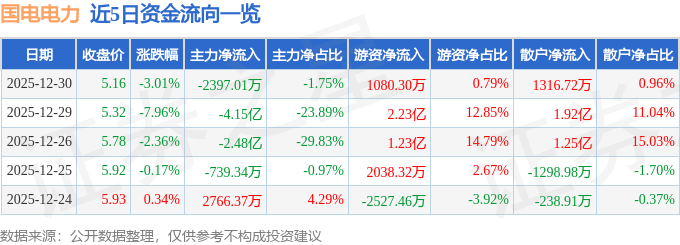 证券之星消息,截至2025年12月30日收盘,国电电力(600795)报收于5.16元,下跌3.01%,换手率1.48%,成交量264.81万手,成交额13.73亿元。