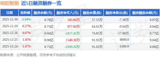 明阳智能融资融券信息显示,融资方面,当日融资买入5861.73万元,融资偿还5518.69万元,融资净买入343.04万元。融券方面,融券卖出2200.0股,融券偿还7.6万股,融券余量57.53万股,融券余额825.56万元。融资融券余额8.87亿元。