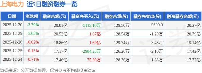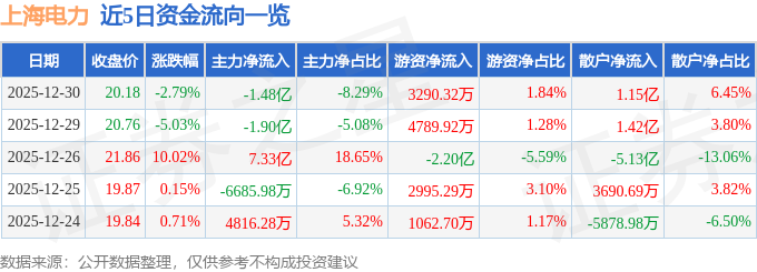证券之星消息,截至2025年12月30日收盘,上海电力(600021)报收于20.18元,下跌2.79%,换手率3.14%,成交量88.65万手,成交额17.9亿元。