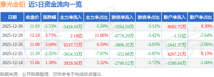 证券之星消息,截至2025年12月30日收盘,豫光金铅(600531)报收于11.93元,下跌2.53%,换手率7.34%,成交量88.75万手,成交额10.46亿元。