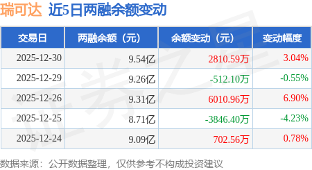 证券之星消息,12月30日,瑞可达(688800)融资买入1.45亿元,融资偿还1.17亿元,融资净买入2810.81万元,融资余额9.52亿元。