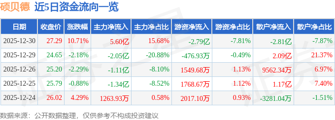 证券之星消息,截至2025年12月30日收盘,硕贝德(300322)报收于27.29元,上涨10.71%,换手率29.53%,成交量130.05万手,成交额35.74亿元。
