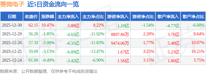 证券之星消息,截至2025年12月30日收盘,赛微电子(300456)报收于62.15元,上涨10.47%,换手率20.15%,成交量120.4万手,成交额71.46亿元。
