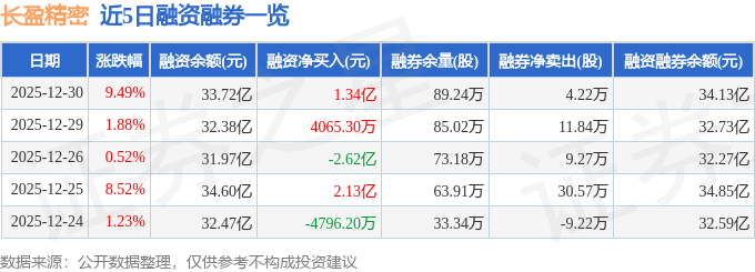 长盈精密融资融券信息显示,融资方面,当日融资买入13.44亿元,融资偿还12.09亿元,融资净买入1.34亿元。融券方面,融券卖出9.87万股,融券偿还5.65万股,融券余量89.24万股,融券余额4027.39万元。融资融券余额34.13亿元。