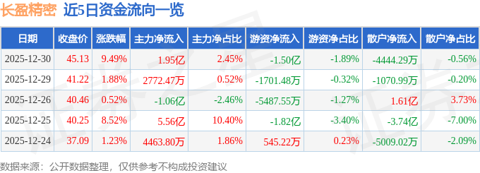 证券之星消息,截至2025年12月30日收盘,长盈精密(300115)报收于45.13元,上涨9.49%,换手率13.39%,成交量181.63万手,成交额79.4亿元。
