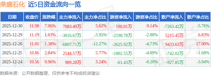 证券之星消息,截至2025年12月30日收盘,荣盛石化(002493)报收于11.98元,上涨7.06%,换手率1.15%,成交量107.21万手,成交额12.61亿元。