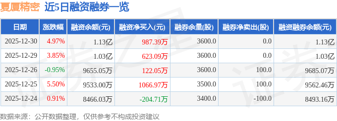 夏厦精密融资融券信息显示,融资方面,当日融资买入3913.03万元,融资偿还2925.64万元,融资净买入987.39万元,连续3日净买入累计1732.53万元。融券方面,融券卖出0.0股,融券偿还0.0股,融券余量3600.0股,融券余额32.72万元。融资融券余额1.13亿元。