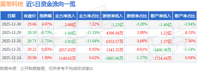 证券之星消息,截至2025年12月30日收盘,蓝思科技(300433)报收于29.66元,上涨4.07%,换手率2.55%,成交量126.78万手,成交额37.14亿元。