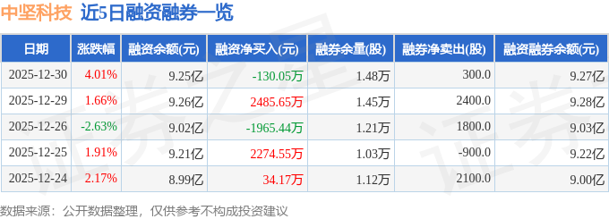 中坚科技融资融券信息显示,融资方面,当日融资买入6195.3万元,融资偿还6325.36万元,融资净偿还130.05万元。融券方面,融券卖出1300.0股,融券偿还1000.0股,融券余量1.48万股,融券余额174.57万元。融资融券余额9.27亿元。
