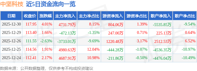 证券之星消息,截至2025年12月30日收盘,中坚科技(002779)报收于117.95元,上涨4.01%,换手率3.02%,成交量5.0万手,成交额5.8亿元。