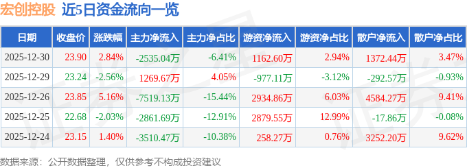 证券之星消息,截至2025年12月30日收盘,宏创控股(002379)报收于23.9元,上涨2.84%,换手率1.47%,成交量16.65万手,成交额3.95亿元。