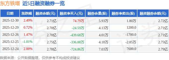 证券之星消息,截至2025年12月30日收盘,东方铁塔(002545)报收于18.55元,上涨2.49%,换手率1.22%,成交量13.78万手,成交额2.54亿元。