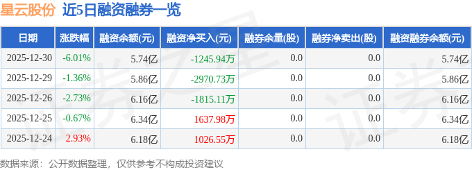 证券之星消息,截至2025年12月30日收盘,星云股份(300648)报收于51.93元,下跌6.01%,换手率7.83%,成交量10.39万手,成交额5.45亿元。