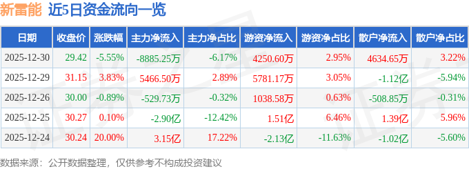 证券之星消息,截至2025年12月30日收盘,新雷能(300593)报收于29.42元,下跌5.55%,换手率10.75%,成交量48.39万手,成交额14.4亿元。
