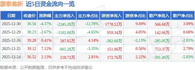 证券之星消息,截至2025年12月30日收盘,蒙泰高新(300876)报收于36.56元,下跌4.37%,换手率6.07%,成交量4.93万手,成交额1.83亿元。