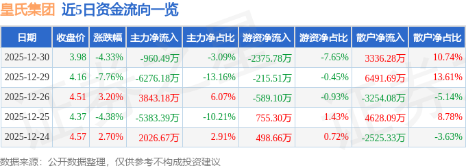 证券之星消息,截至2025年12月30日收盘,皇氏集团(002329)报收于3.98元,下跌4.33%,换手率11.97%,成交量77.86万手,成交额3.11亿元。