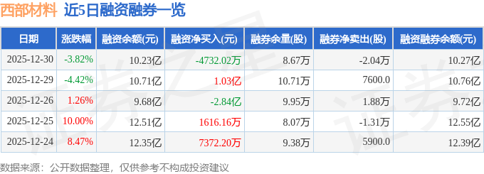 证券之星消息,截至2025年12月30日收盘,西部材料(002149)报收于43.0元,下跌3.82%,换手率23.53%,成交量114.86万手,成交额51.17亿元。