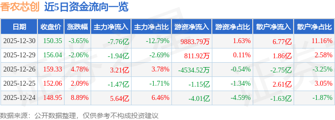 证券之星消息,截至2025年12月30日收盘,香农芯创(300475)报收于150.35元,下跌3.65%,换手率8.89%,成交量39.59万手,成交额60.68亿元。