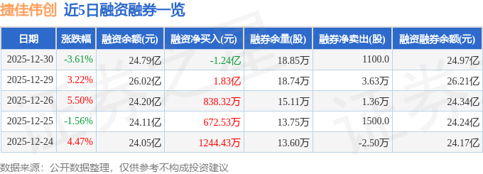 捷佳伟创融资融券信息显示,融资方面,当日融资买入3.67亿元,融资偿还4.91亿元,融资净偿还1.24亿元。融券方面,融券卖出4000.0股,融券偿还2900.0股,融券余量18.85万股,融券余额1830.34万元。融资融券余额24.97亿元。