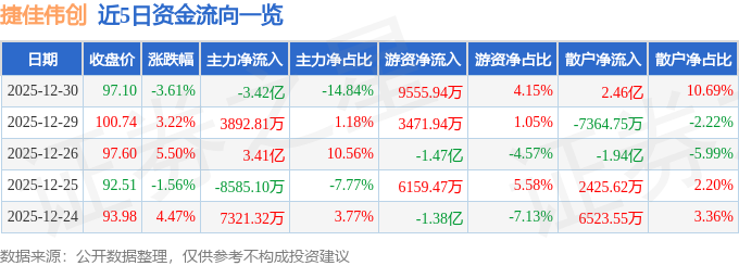 证券之星消息,截至2025年12月30日收盘,捷佳伟创(300724)报收于97.1元,下跌3.61%,换手率8.13%,成交量23.4万手,成交额23.04亿元。