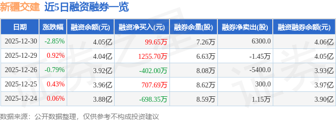 新疆交建融资融券信息显示,融资方面,当日融资买入3549.1万元,融资偿还3449.45万元,融资净买入99.65万元。融券方面,融券卖出8100.0股,融券偿还1800.0股,融券余量7.26万股,融券余额116.45万元。融资融券余额4.06亿元。