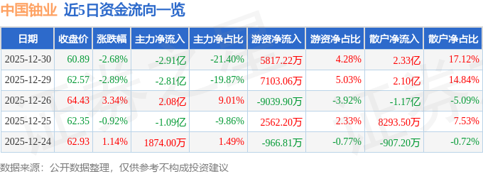 证券之星消息,截至2025年12月30日收盘,中国铀业(001280)报收于60.89元,下跌2.68%,换手率14.06%,成交量22.23万手,成交额13.59亿元。
