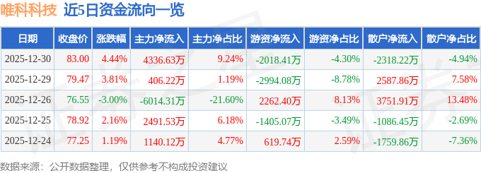 证券之星消息,截至2025年12月30日收盘,唯科科技(301196)报收于83.0元,上涨4.44%,换手率4.63%,成交量5.77万手,成交额4.69亿元。