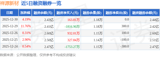 祥源新材融资融券信息显示,融资方面,当日融资买入5671.18万元,融资偿还5507.37万元,融资净买入163.81万元。融券方面,融券卖出0.0股,融券偿还0.0股,融券余量1.18万股,融券余额39.6万元。融资融券余额2.44亿元。