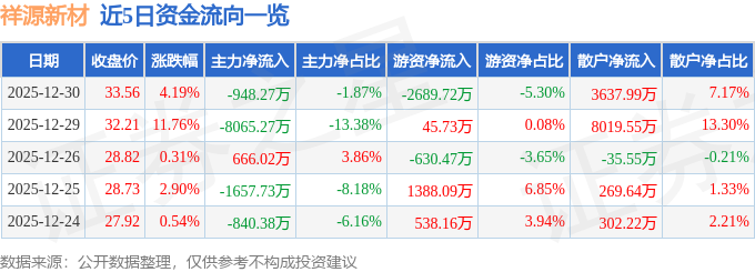 证券之星消息,截至2025年12月30日收盘,祥源新材(300980)报收于33.56元,上涨4.19%,换手率15.66%,成交量15.4万手,成交额5.07亿元。