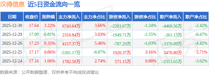 证券之星消息,截至2025年12月30日收盘,汉得信息(300170)报收于17.64元,上涨3.22%,换手率10.52%,成交量102.77万手,成交额18.42亿元。