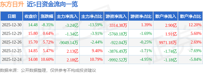 证券之星消息,截至2025年12月30日收盘,东方日升(300118)报收于14.48元,下跌8.35%,换手率17.14%,成交量158.82万手,成交额23.81亿元。