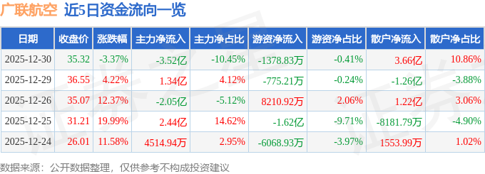 证券之星消息,截至2025年12月30日收盘,广联航空(300900)报收于35.32元,下跌3.37%,换手率39.96%,成交量90.33万手,成交额33.68亿元。