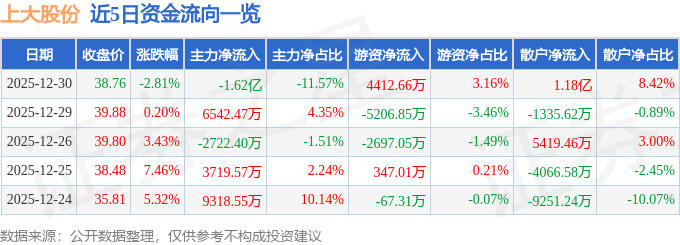 证券之星消息,截至2025年12月30日收盘,上大股份(301522)报收于38.76元,下跌2.81%,换手率12.56%,成交量35.35万手,成交额13.98亿元。