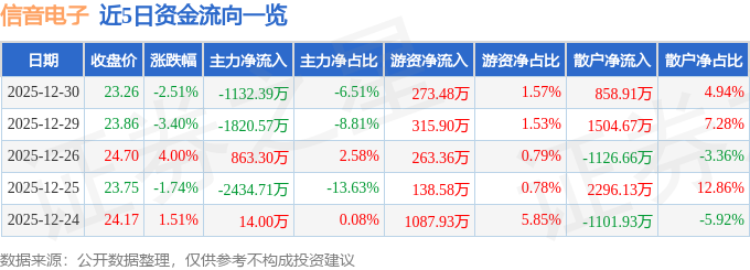 证券之星消息,截至2025年12月30日收盘,信音电子(301329)报收于23.26元,下跌2.51%,换手率12.3%,成交量7.38万手,成交额1.74亿元。