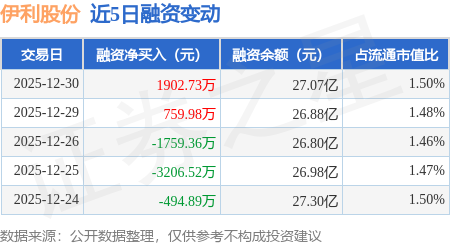 证券之星消息,12月30日,伊利股份(600887)融资买入6745.96万元,融资偿还4843.23万元,融资净买入1902.73万元,融资余额27.07亿元,近20个交易日中有11个交易日出现融资净买入。