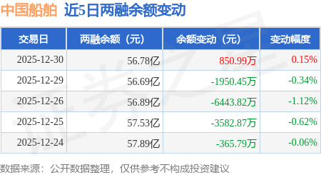 证券之星消息,12月30日,中国船舶(600150)融资买入1.41亿元,融资偿还1.33亿元,融资净买入841.89万元,融资余额56.72亿元。