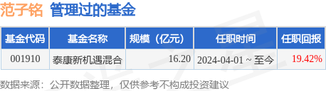 范子铭先生:中国国籍,硕士研究生。范子铭于2021年7月加入泰康公募,现任泰康基金股票基金经理。2013年7月至2014年7月在中国出口信用保险公司担任经办研究员、2014年8月至2016年5月在华夏基金管理有限公司担任策略研究员、2016年6月至2018年3月在华创证券股份有限公司担任策略分析师、2018年4月至2021年7月在长盛基金管理有限公司担任研究员等职务。2024年4月1日至今担任泰康新机遇灵活配置混合型证券投资基金基金经理。