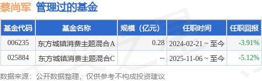 蔡尚军先生:中国国籍,清华大学化学专业博士。曾任方正证券股份有限公司助理研究员、中海基金管理有限公司研究员。2020年8月加盟东方基金管理股份有限公司,曾任权益研究部研究员、高级研究员,东方品质消费一年持有期混合型证券投资基金基金经理助理、东方创新医疗股票型证券投资基金基金经理助理。2024年02月21日起担任东方城镇消费主题混合型证券投资基金基金经理。