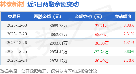 证券之星消息,12月30日,林泰新材(920106)融资买入239.7万元,融资偿还212.0万元,融资净买入27.71万元,融资余额3089.78万元,近3个交易日已连续净买入累计135.35万元,近20个交易日中有11个交易日出现融资净买入。