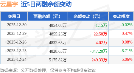 证券之星消息,12月30日,云星宇(920806)融资买入193.87万元,融资偿还195.02万元,融资净卖出1.15万元,融资余额4854.08万元,近20个交易日中有12个交易日出现融资净买入。