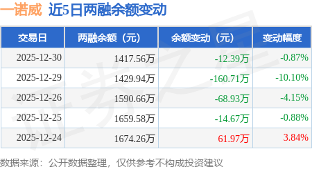 证券之星消息,12月30日,一诺威(920261)融资买入69.49万元,融资偿还81.87万元,融资净卖出12.39万元,融资余额1417.56万元。